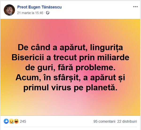 „De când a apărut, lingurița Bisericii a trecut prin miliarde de guri, fără probleme. Acum, în sfârșit, a apărut și primul virus pe planetă.“, a scris Tănăsescu într-una dintre postările sale.