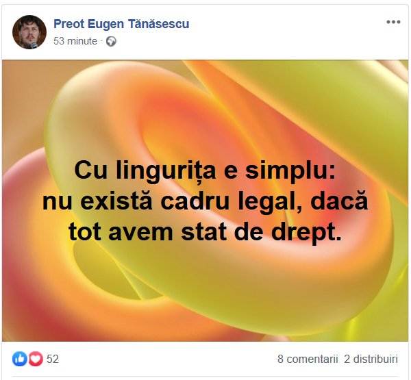 În rest, nu pot să nu observ că ideea linguriței pleacă de la niște lingurari în ale teologiei, care scot idei pe post de linguri de lemn.“, a precizat Eugen Tănăsescu într-o postare făcută pe data de 17 martie.