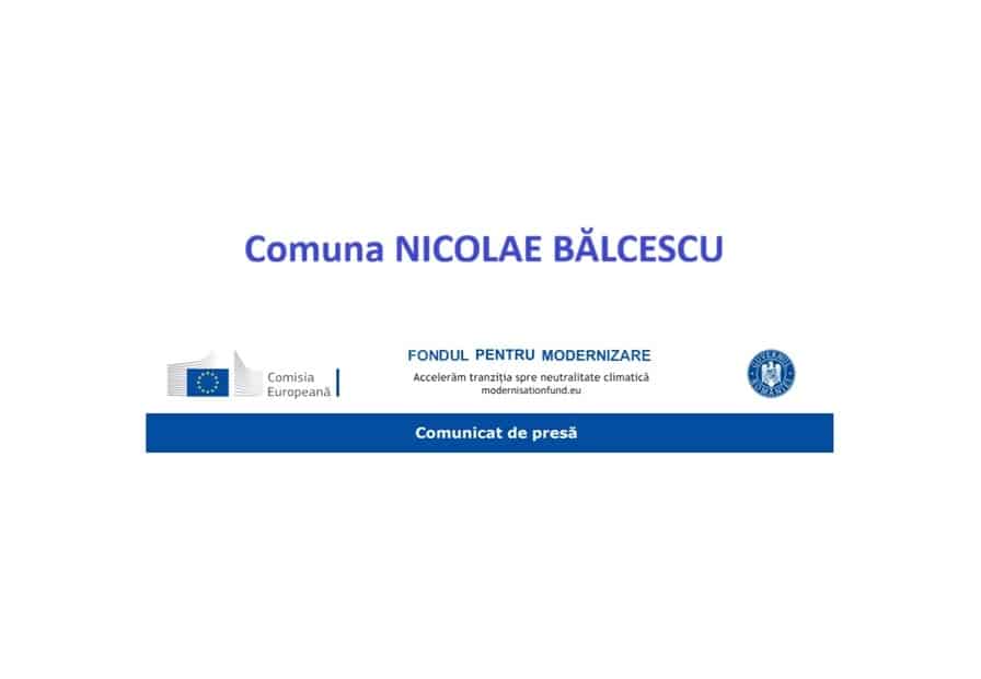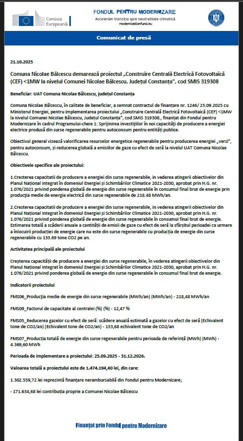 Comuna Nicolae Bălcescu, în calitate de beneficiar, a semnat contractul de finanțare nr. 1246/ 25.09.2025 cu Ministerul Energiei, pentru implementarea proiectului „Construire Centrală Electrică Fotovoltaică (CEF) <1MW la nivelul Comunei Nicolae Bălcescu, Județul Constanța”, cod SMIS 319308., finanțat din Fondul pentru Modernizare în cadrul Programului-cheie 1: Sprijinirea investiţiilor în noi capacităţi de producere a energiei electrice produsă din surse regenerabile pentru autoconsum pentru entități publice.