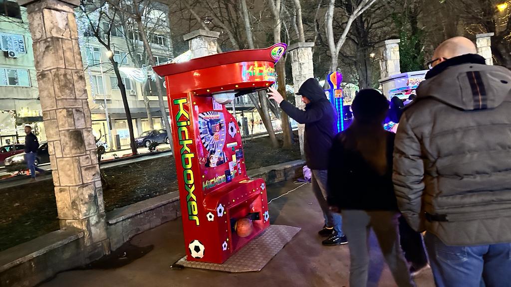 Încercăm un vin fier la 12 lei/250 ml. Un rivanol încălzit cu tot cu pansament și coaja de pe rană. Nu se poate bea. Mai facem câțiva pași și admirăm celebrul aparat cu sac de box din Satul de Vacanță. Cinci smardoiași l-au încolțit și aveau de gând să își vină de hac. Cu fisele îndesate în nădragii largi, dar gleznuțele la vedere, cu tricourile albe inscripționate Armani cu 3 numere mai mici, pumnii bombardierilor zboară haotice în sacul mecanizat. Ne facem loc pentru a ne încerca și noi norocula la aparatul din care putem câștia un ceas Rolet sau un telefon Samsug.