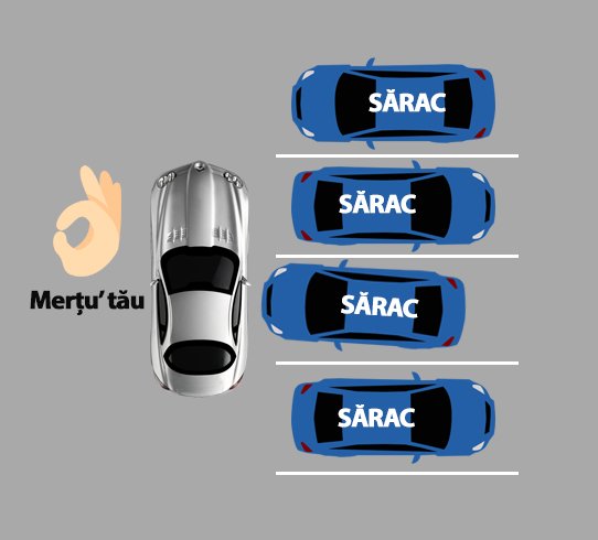 Nu este absolut nicio problemă dacă staționezi în paralel cu mașinile parcate perpendicular (vezi desenul de mai jos). Cu atât mai mult, este foarte ok să nu lași niciun număr de telefon pe parbriz, în caz că vreun amărăștean pe care l-ai blocat ar vrea să plece. În fond, cui îi pasă? Trebuia să se gândească înainte să parcheze regulamentar și mai dă-l în morții mă-sii cu mașina lui de sărac!