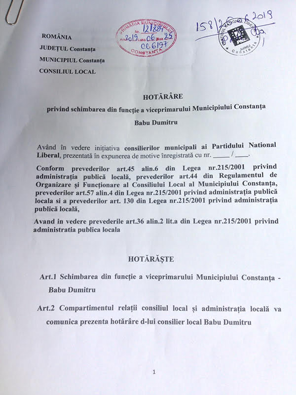 „Am depus astăzi la Secretariatul Consiliului Local Constanța, proiectul de hotărâre privind schimbarea din funcție a viceprimarului Municipiului Constanța, Dumitru Babu.
