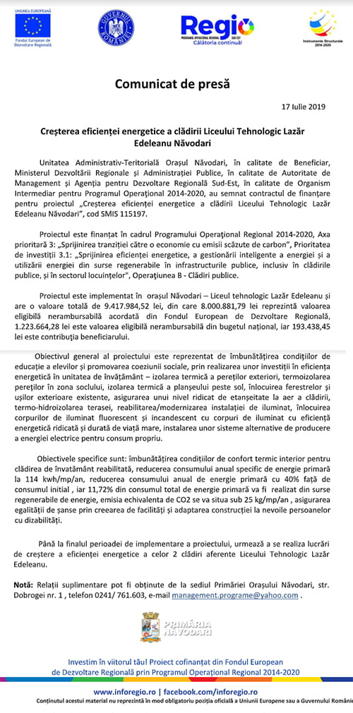 Unitatea Administrativ-Teritorială Orașul Năvodari, în calitate de Beneficiar, Ministerul Dezvoltării Regionale și Administrației Publice, în calitate de Autoritate de Management și Agenția pentru Dezvoltare Regională Sud-Est, în calitate de Organism Intermediar pentru Programul Operaţional 2014-2020, au semnat contractul de finanțare pentru proiectul „Creșterea eficienței energetice a clădirii Liceului Tehnologic Lazăr Edeleanu Năvodari”, cod SMIS 115197.
