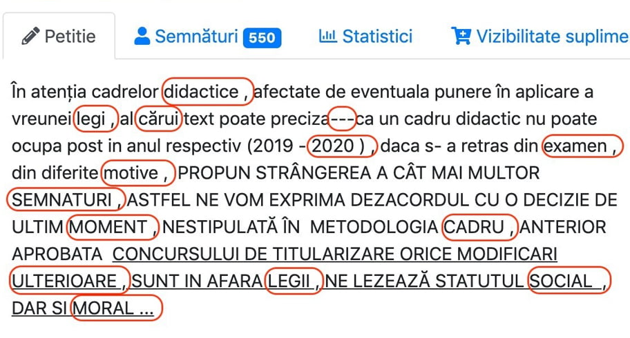 Mai multe persoane care s-au retras din examenul de angajare în școală au scris o petiție, nemuțumiți fiind de faptul că au picat titularizarea. Deși are un singur paragraf, format dintr-o frază continuă, petiția conține numeroase greșeli gramaticale, transmite edupedu.ro