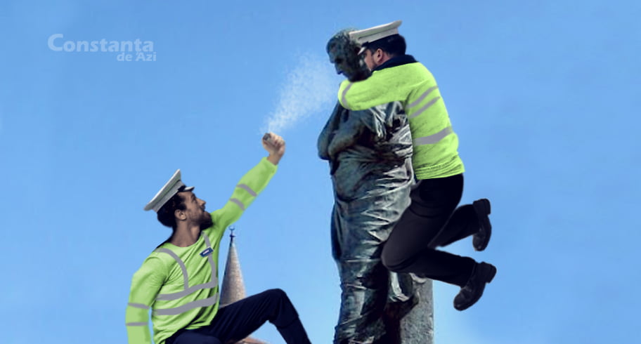 „L-am depistat uşor, pentru că se cocoţase acolo pe monumentul ăla şi se vedea de la o poştă că nu poartă mască de protecţie“, povesteşte agentul Ionel Şerlăchăums. „Am intervenit imediat!“.