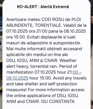 IGSU a emis un mesaj RO-Alert pentru județul Constanța, COD ROȘU de PLOI ABUNDENTE TORENȚIALE.