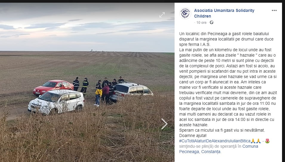 Am înțeles că mâine (n.r. – luni) vor fi verificate și aceste haznale care trebuiau verificate mult mai devreme, din ce am auzit copilul a fost văzut pe camerele de supraveghere de la marginea localiății sâmbătă în jur de ora 11:00 nu foarte departe de locul unde au fost găsite rolele, mai mulți oameni au declarat că au vazut rolele în acel loc sâmbătă în jur de ora 14:00 și în direcție cu aceste haznale. Sperăm că micuțul va fi găsit viu și nevătămat”, au transmis cei de la Asociația Umanitară Solidarity Children.
