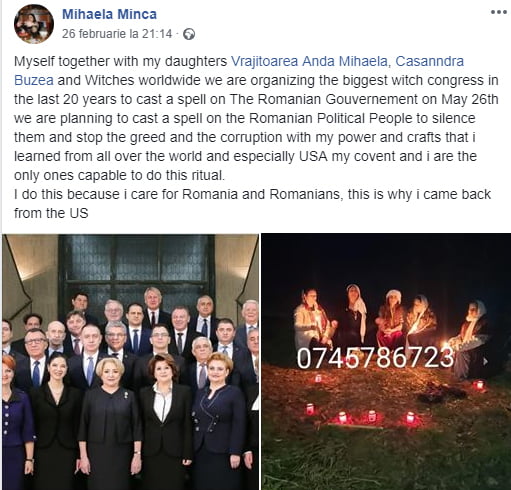 Văzuta ca una dintre cele mai puternice vrăjitoare, Mihaela Mincă a anunțat pe contul ei de Facebook că va organiza cel mai mare congres al vrăjitoarelor pentru a arunca o vrajă asupra Guvernului.