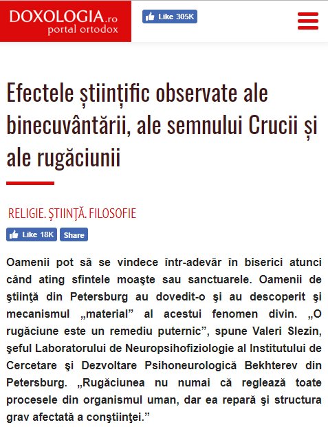Publicații online precum Flacăra Ortodoxiei sau Doxologia (ce aparține Mitropoliei Moldovei și Bucovinei), publică articole în care sunt menționați sau citați anumiți „oameni de știință“ din Rusia, care ar fi descoperit că rugăciunea și a face semnul crucii sunt benefice din punct de vedere medical.