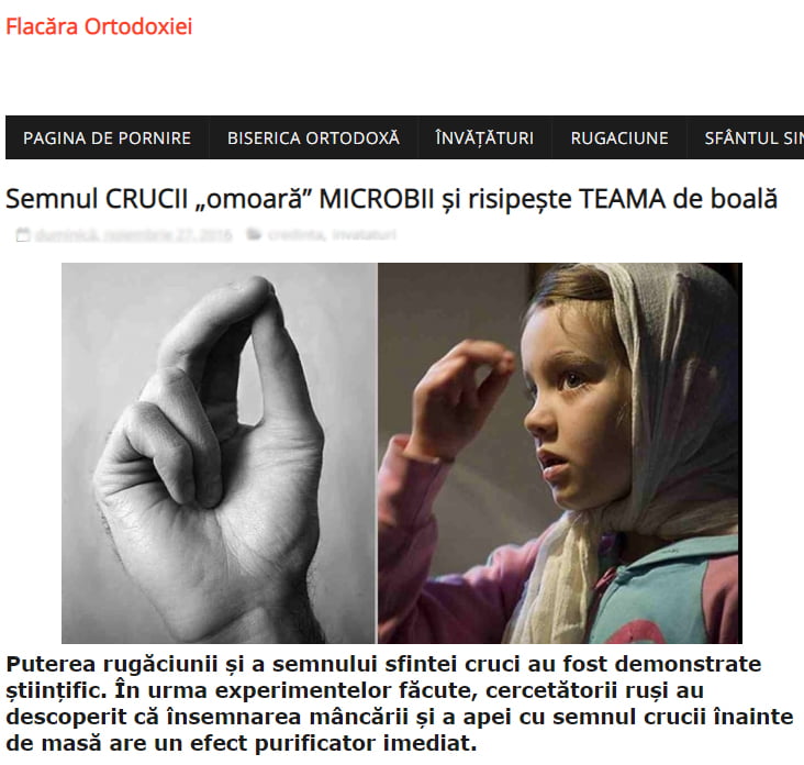 „Semnul Crucii omoară microbii și risipește teama de boală“ sau „Efectele științific observate ale binecuvântării, ale semnului Crucii și ale rugăciunii“ sunt două dintre titlurile de pe site-uri precum flacaraortodoxiei.ro sau doxologia.ro în care este promovată ideea că semnul crucii, rugăciunea sau bătutul clopotelor ar avea efecte medicale benefice demonstrate științific.