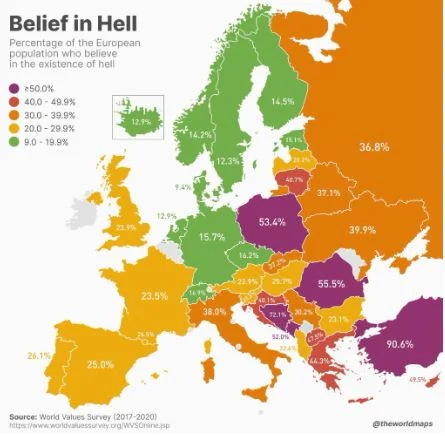 România se află în topul țărilor de pe continentul european unde trăiesc cei mai mulți oameni care cred în existența Iadului, conform rezultatelor unui sondaj realizat de organizația World Values Survey.