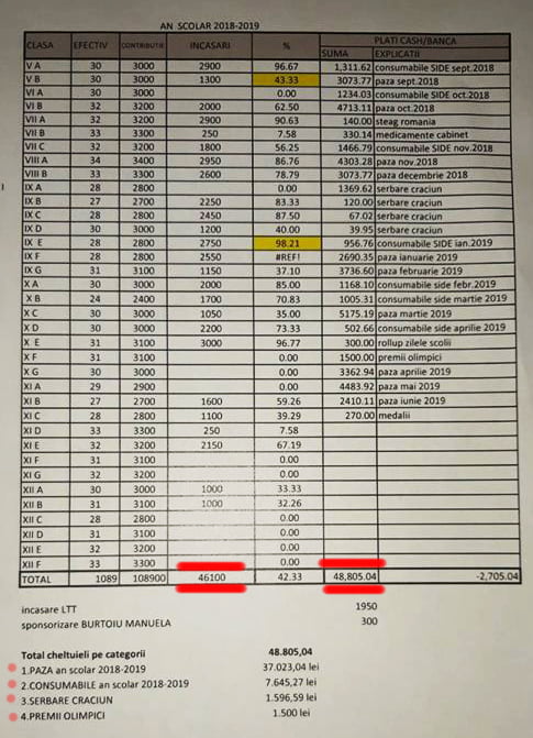 Pe tabelul publicat de Roxana, pot fi observate clar sumele strânse de la fiecare clasă, cuprinse între 1.000 și 3.000 de lei, cu un total al încasărilor de 46.100 de lei, însemnând 9.700 de euro.
