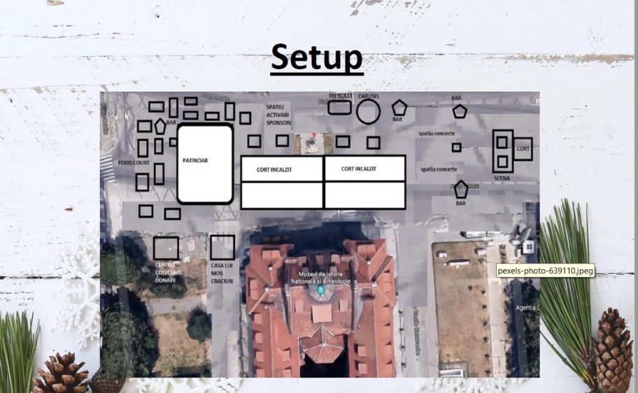Vizitatorii se pot bucura de concerte și spectacole, un târg tradițional cu decorațiuni și produse de sezon, cadouri, dulciuri, mâncare și băuturi, precum și un patinoar, un carusel, un trenuleț, mașinuțe pentru copii, căsuța lui Moș Crăciun, bradul de Crăciun și un loc special amenajat pentru Donații către cei nevoiași.