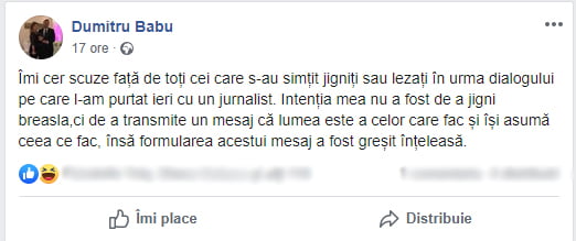 „Bă, săracule, la umbra mea cresc flori, pricepi? Eu lucrez din umbră, bă! La umbra ta crește ceva? Contribuie umbra ta cu ceva la orașul ăsta? Nu! Îți zic io că nu! Așa sunteți voi, ăștia care vreți să schimbați lumea!“, a mai spus viceprimarul. „La c***t cu voi și îmi cer scuze!“.