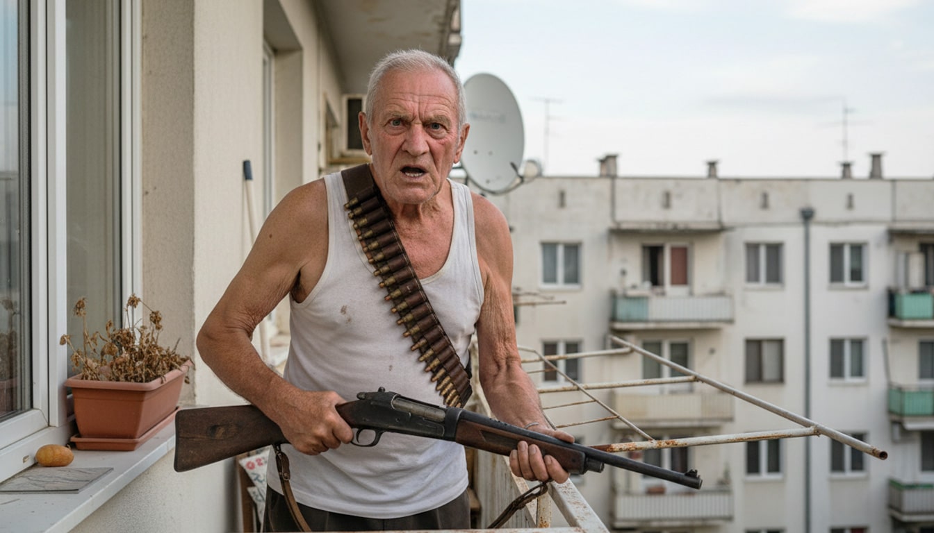 Un bătrânel din Constanța protestează înarmat pe balcon. Nimeni nu apreciază și nimănui nu-i pasă